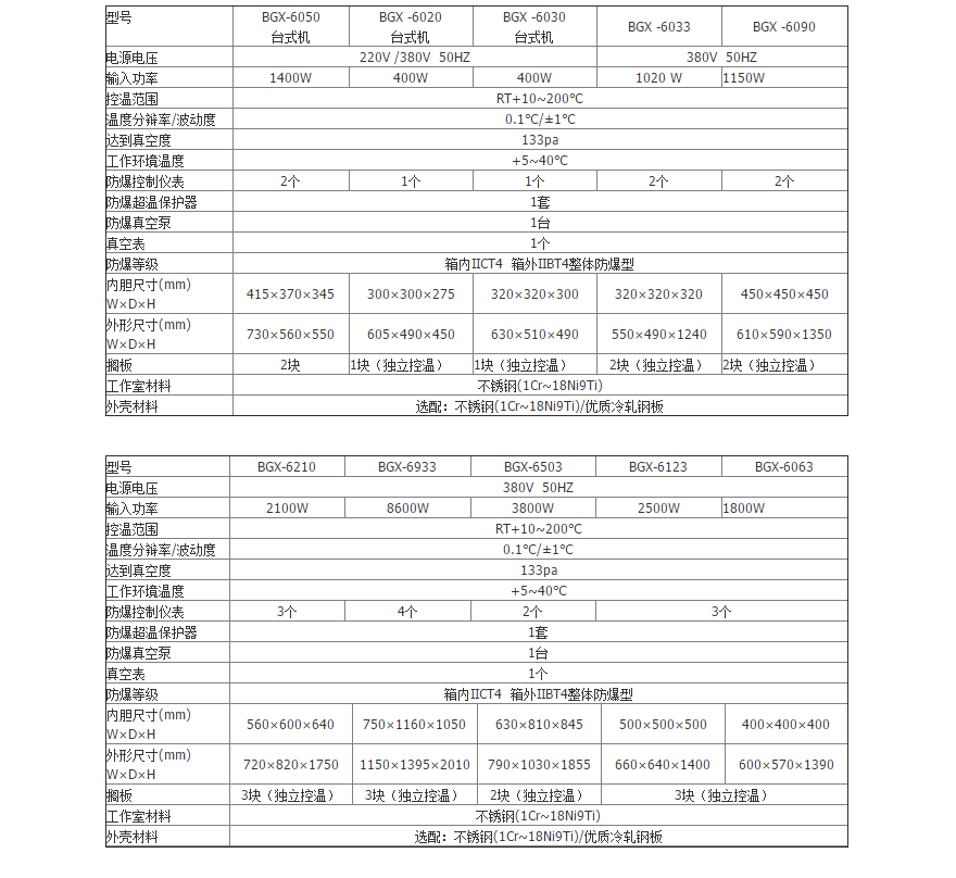 防爆真空干燥箱技術參數: